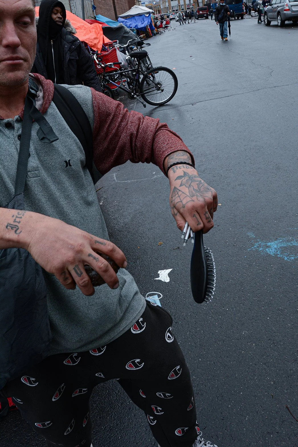 Dustin was in a car accident, his doctor prescribed him opiods and he became addicted. Once the doctor stopped prescribing, he began sniffing heroin. Dustin was full of anger as he told me that the biggest drug dealers are the doctors and big pharma. I asked about his family, he had a wife, he paused swallowing heavily to fight back tears and said he had a restraining order on him because of the things he has done. Only one of his three kids still talks to him. “I am a slave to the needle, I have hurt, stole, broke and destroyed everything around”. He could not fight back the tears, he just let it out and Matty put his arm around him. We took a break, just sitting in silence listening to the noise of the street and chatter of others around us. I then asked Matty, what is your experience interacting with people who were not homeless or addicted to drugs? He said, “they dont understand at all and that most people look at us as less then human, but something that they dont know is this could happened to any mother fucker it is so simple and easy to get hooked to this shit”.