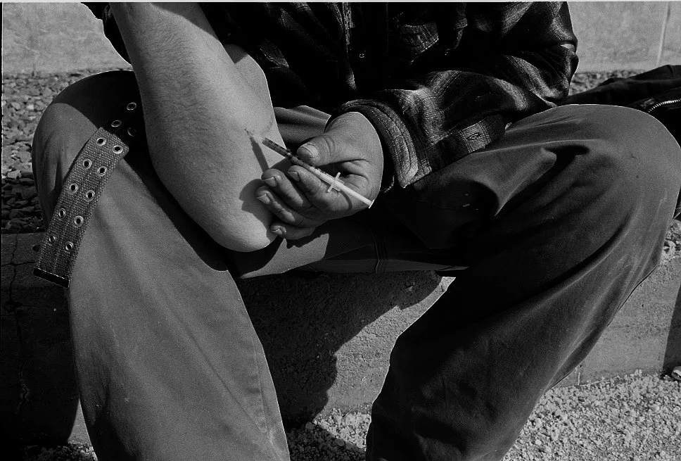 John hurt himself on a dirt bike, was prescribed oxycodone and then got hooked like many of the other stories I have heard. He started using heroin when they stopped filling his prescription. I was with him and his girlfriend and he told me “I am so in love with this woman”. John is a roofer and works when the weather gets warm. He has plans to start work again and get them a nice place to live, because he wants to get off of Atkinson Street. He ask me if i would like to photograph him shooting up. I was a little hesitent, and he said “if you want people to really understand what this is all about you have to show them”. We sat on the sidewalk and he explained to me how you shoot up and how you find the vein. After sitting there with him for through the process, I witnessed the change in his behavior, as more and more heroin was entring his vein he doze off, and was have trouble forming sentence. After a couple of minutes he just became silent. The last thing I told him “I hope I never see you again down here in these circumstance, he smiled and said, “I hope so too”